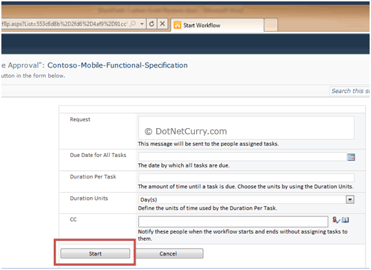 Step 9: Provide submission comments and click OK. The following screen will come up. This screen initiates the default approval workflow. Provide some details in the Request field and click on Start.