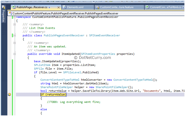 Step 9: Last step is to tie things up. Open the PublishPagesEventReciever.cs file. Below the base.ItemUpdated(properties) method call add the following code: