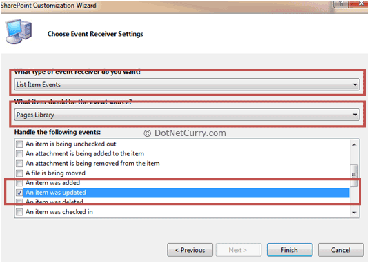 Step 3: As seen below we've selected our "Type of event receiver" to be "List Item Events" and "Event Source" to be the "Pages Library" because that's the library use has the pages that have our custom content type.
