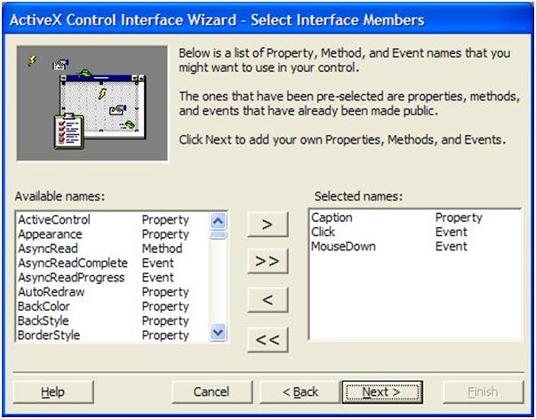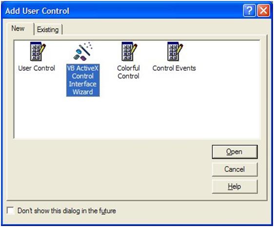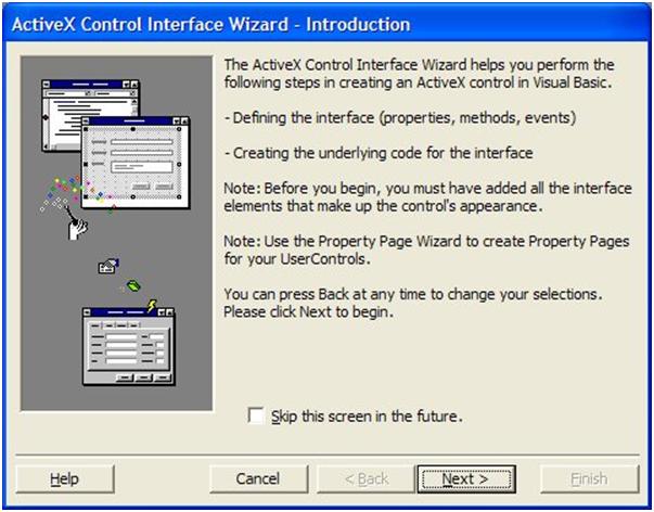 - To do it, you design your control visually first, and then use the Wizard to generate Methods, Events, and Properties. So, get your control ready using whichever scheme you like and start the ActiveX Control Interface Wizard by going project->add user control and then selecting the VB ActiveX Control Interface Wizard from the dialog box that appears.