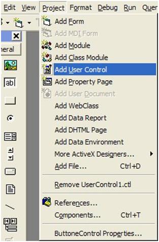 - Building this example is just as easy as above. First, start a regular VB exe project. Then, from the project menu, select "add user control," and then "User Control" from the following dialog.