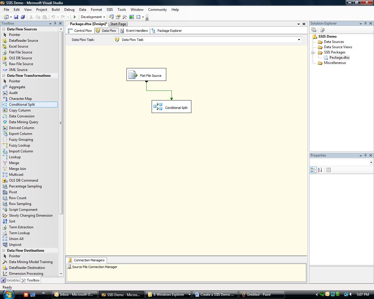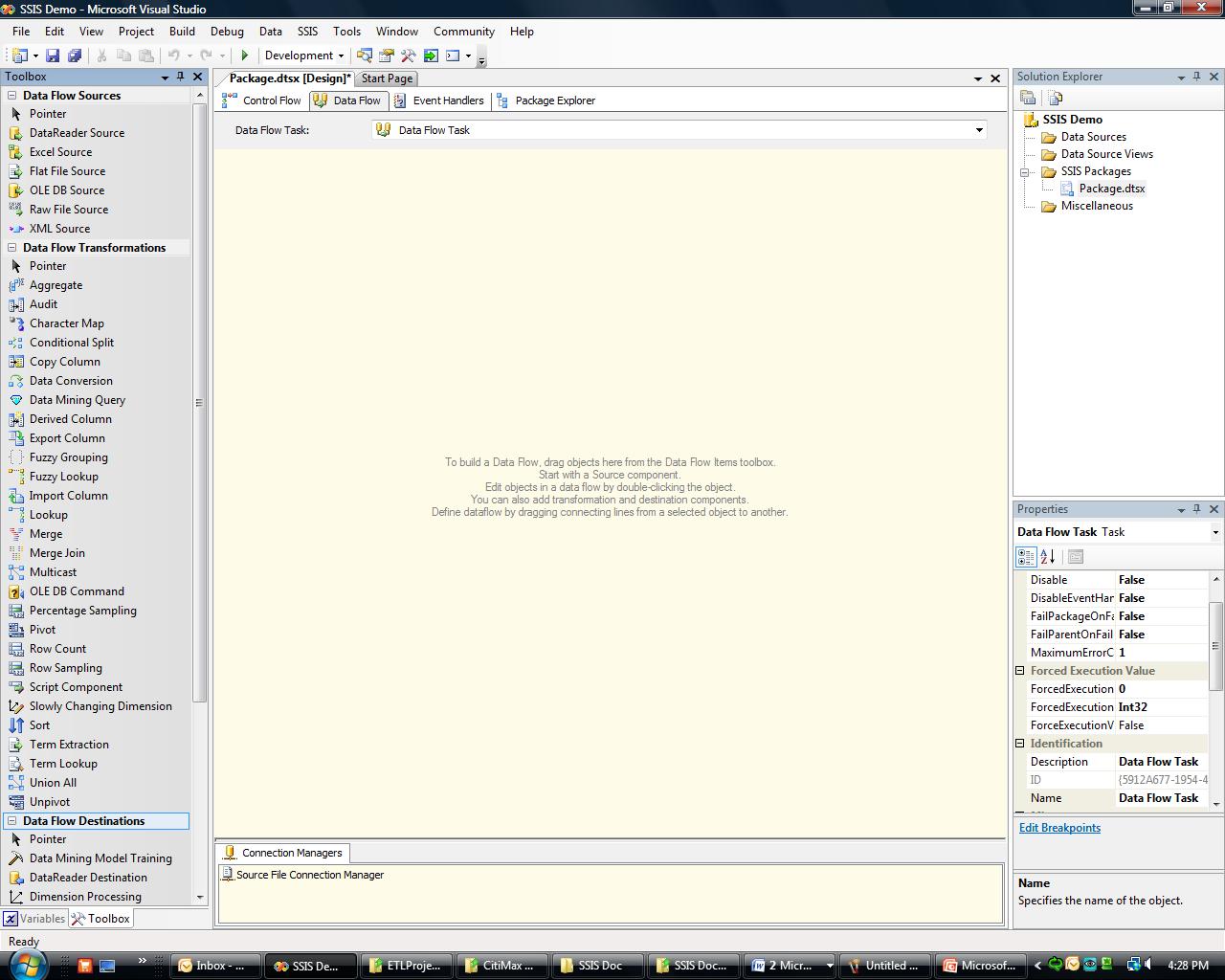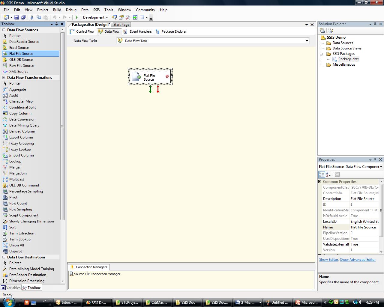 10. Drag a Flat file Source Component from Data Flow Sources into Data Flow Container window.