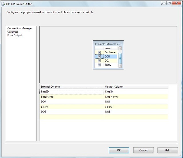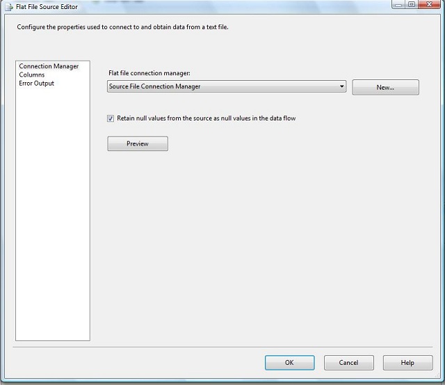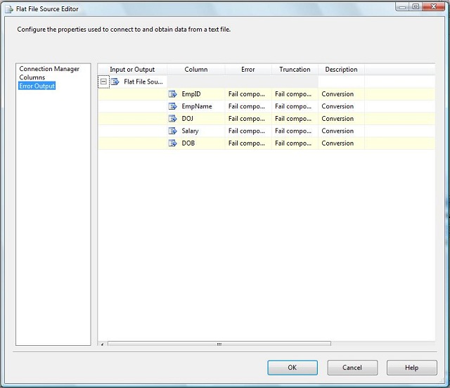 11. Double Click on the Flat File Source Component, it will display flat File source Editor. The window contain three tabs: