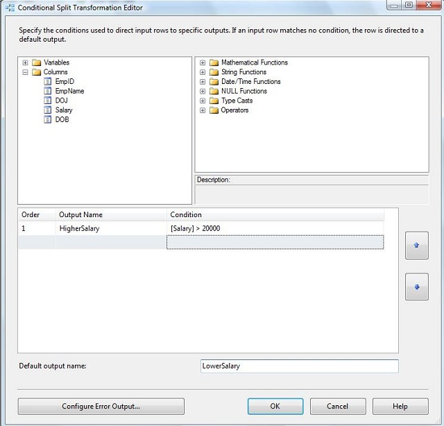 13. Double click on the Conditional Split component, it will open Conditional Spilt Component editor window. Here user can specify the condition(s) as per the requirement and click ok. For example:
