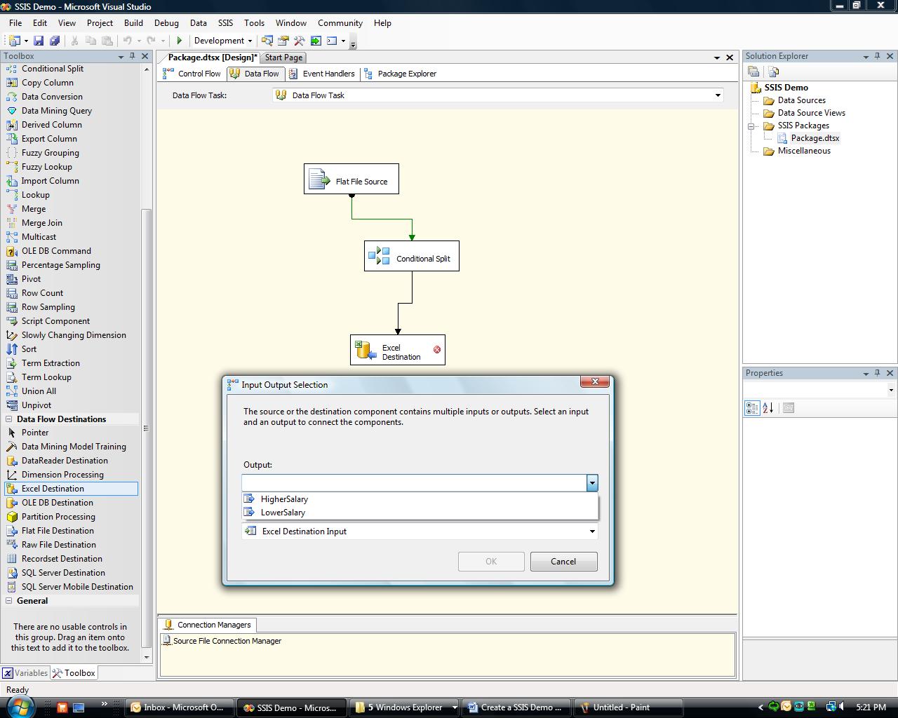 14. Drag and drop Excel Destination component from Data Destinations tab into Data Flow Task Container. Connect the success arrow of the Conditional Split Component to Excel Destination, Input Output selection window will be popped up.