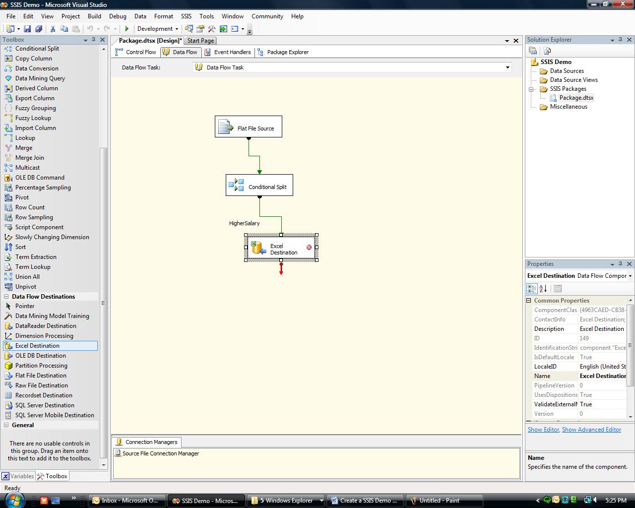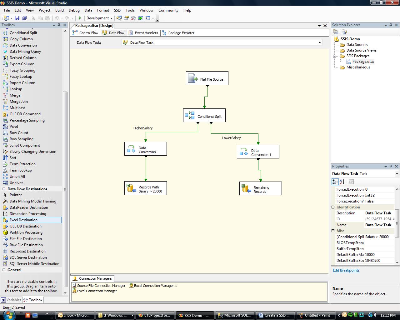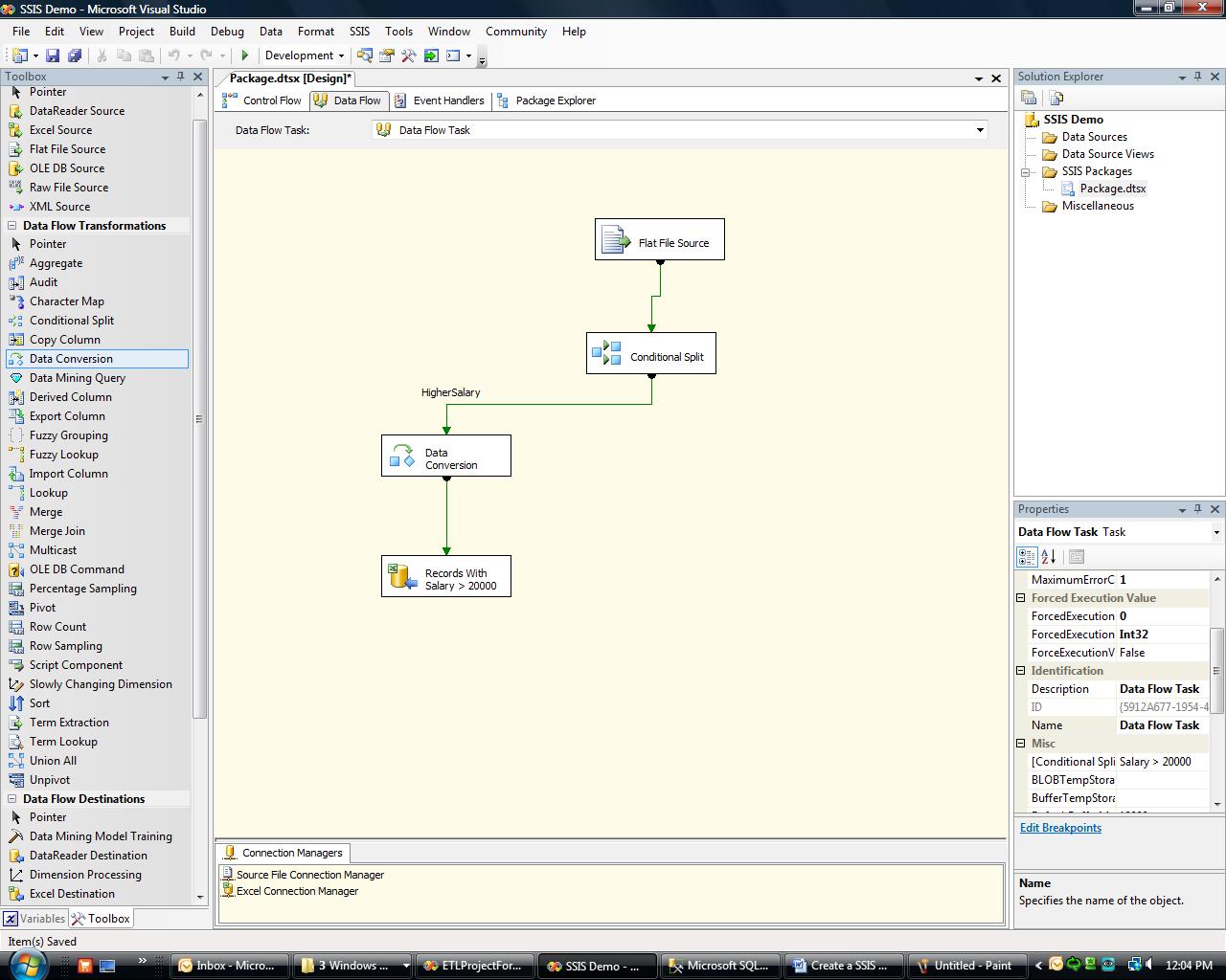The purpose of this tutorial is to provide detailed steps on how to create a SSIS Package. The package given below reads the data from a source tab delimited text file and based on certain conditions, saves the output in two separate Excel Output Files. The output Excel files also have the same header as the input text file. The structure and data for the source input file is given below: