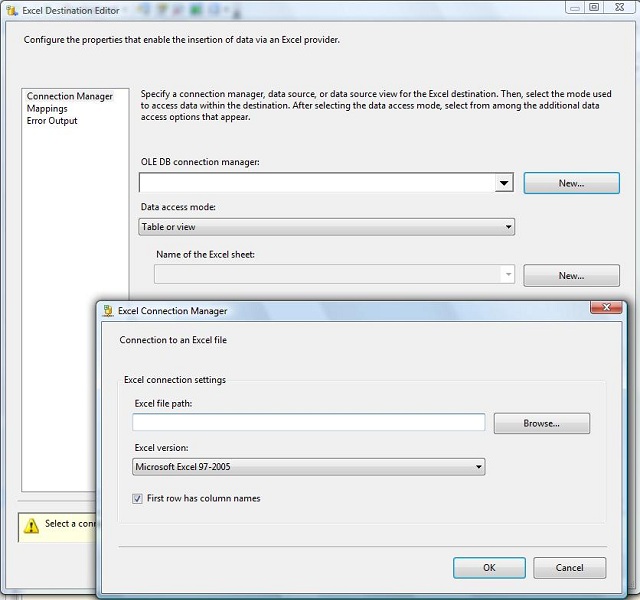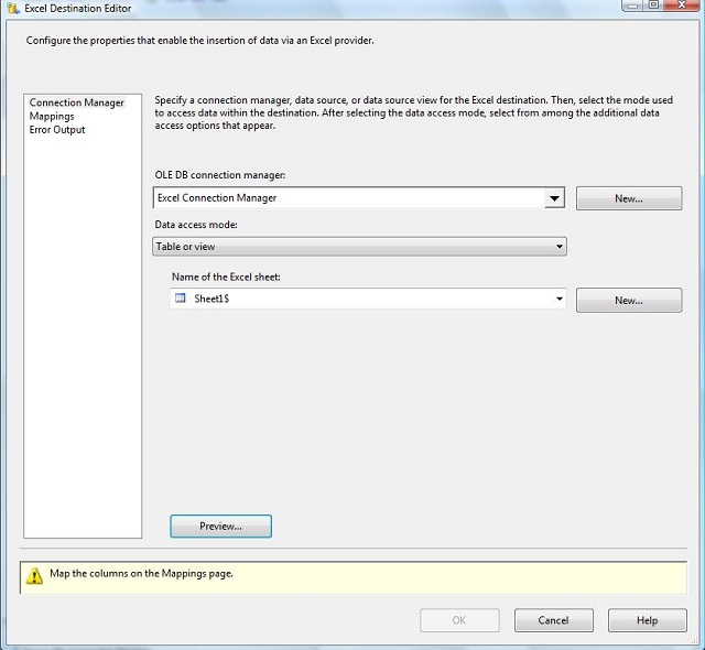 16. Double Click on the Excel Destination Component which will open Excel Destination Editor Window. Click on the new Ole DB Connection Manager Button.