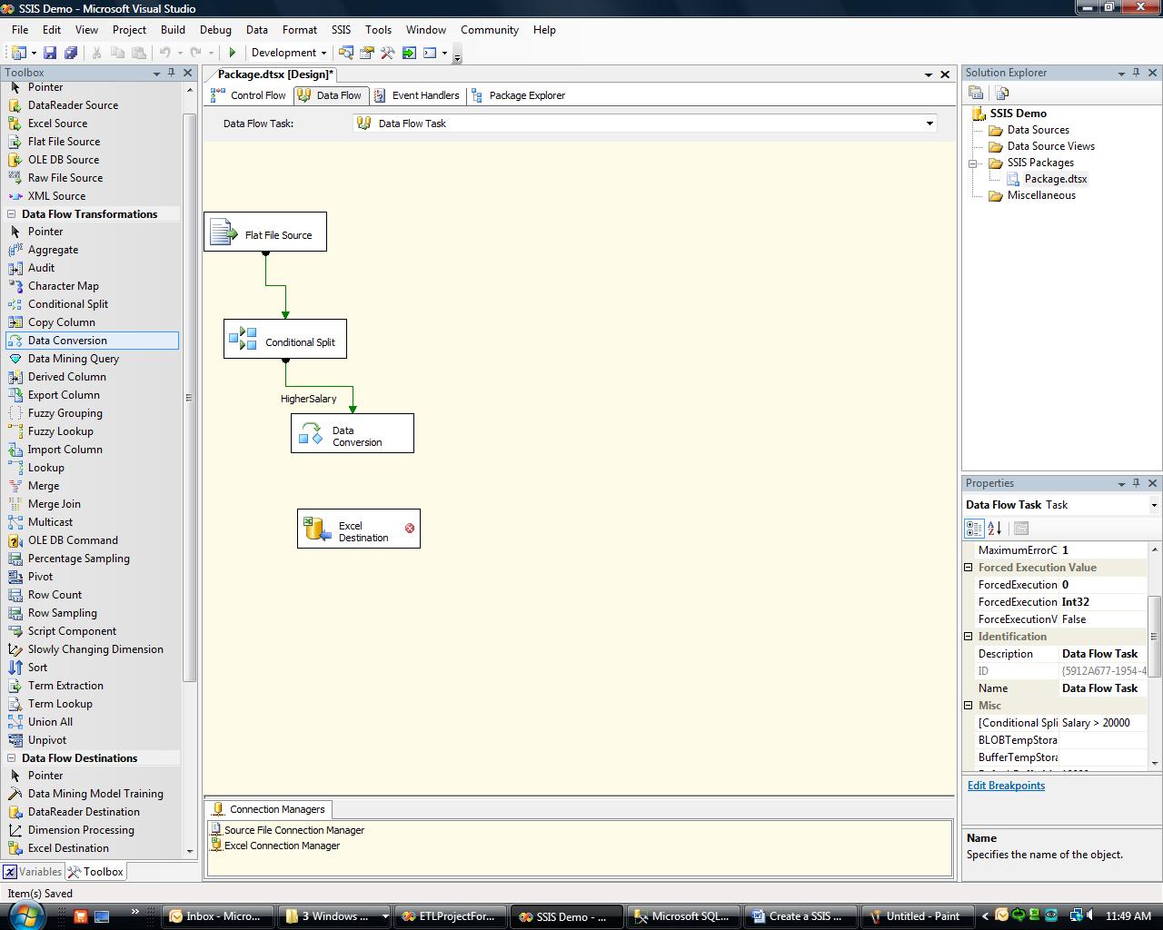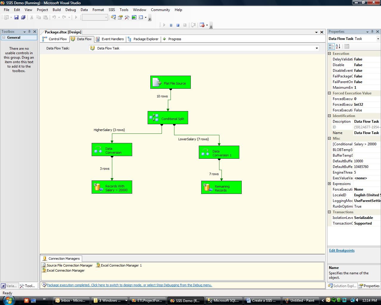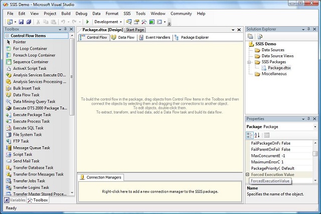 - Control flow, data flow, event Handlers, Package Explorer in tab windows