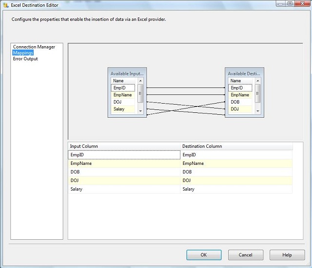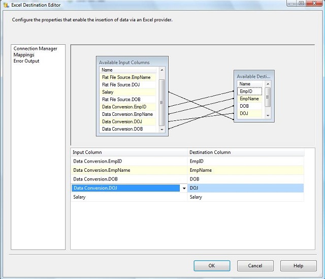 22. Click OK and connect the success arrow of Data Conversion component into Excel Destination Component. Double click on Excel Data Conversion Component and click on the mapping tab and map the output of Data Conversion Component to input of Excel Destination Component and click ok.