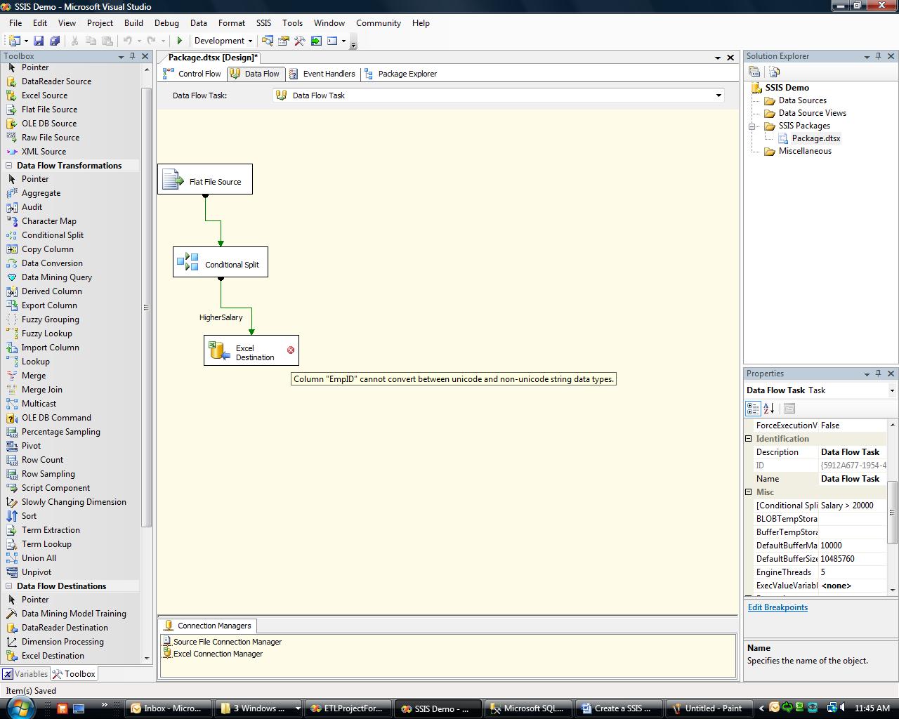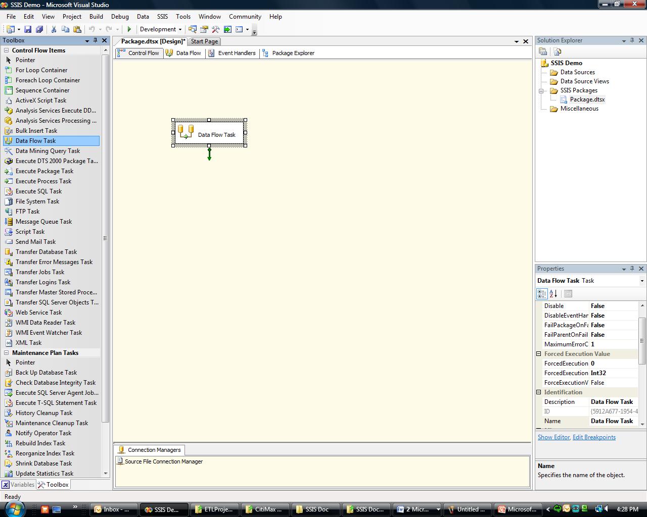 8. Now Drag Data Flow Task from the Toolbox into the Control Flow Container.