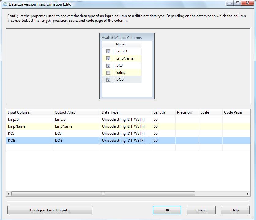 21. Double Click on the Data Conversion Component, it will open Data Conversion Transformation editor. Using this component, convert input data types to required output data types.