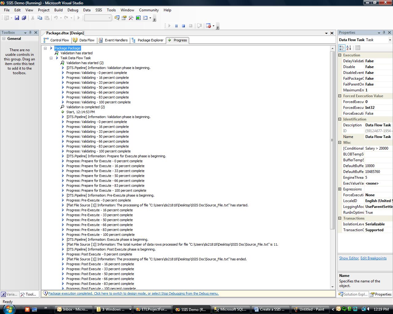 25. Now the package is ready to be executed. Go to the Solution Explorer and right click on the package and select “Execute Package". If all components turn “GREEN”, it means package has run successfully, if there is any error, the component which has failed to execute will be shown in “RED” Color. We can see the package execution steps in the “Progress” tab.
