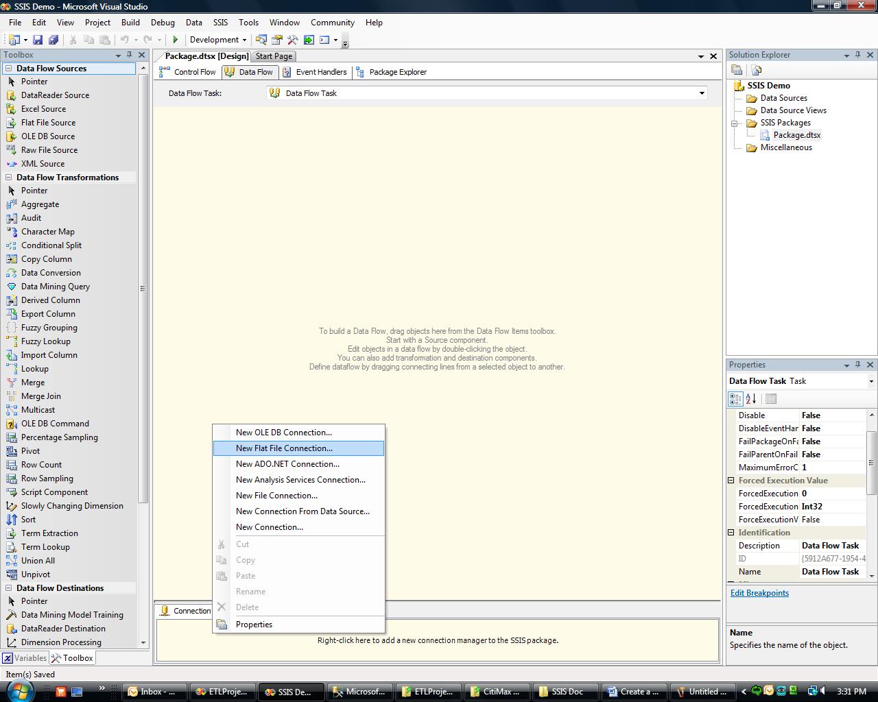 5. Right click on the Connection Manager Tab, click on new FLAT File Connection Menu Item.