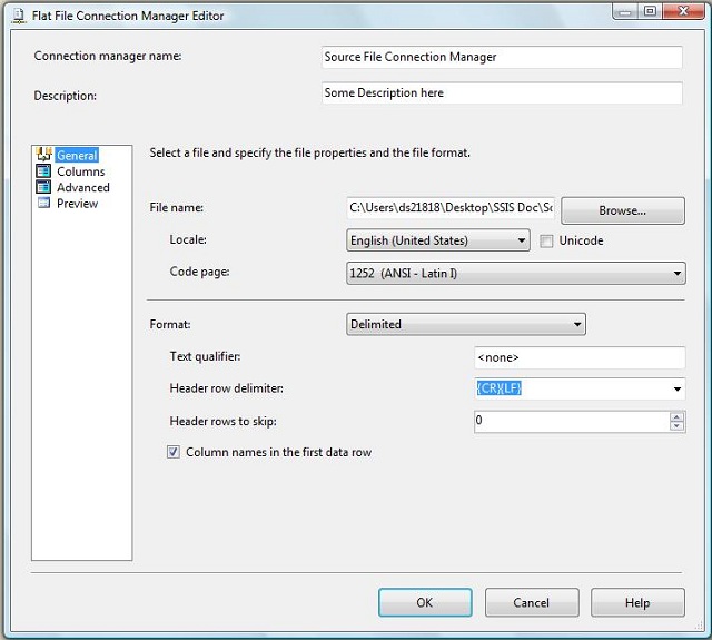 - In General Tab, enter connection manager name and description (optional). Select source file, file format and delimiter. If first row of source file contains headers, then select the checkbox “Column names in the first data row".