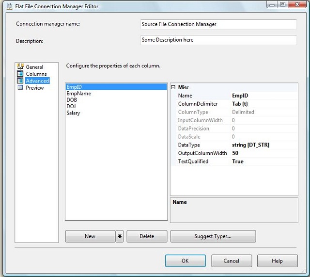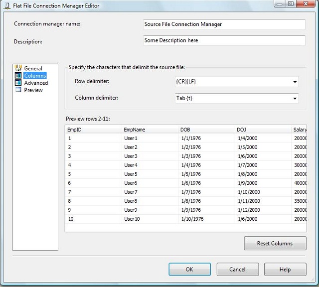 6. Connection manager editor opens up which contains 4 tabs, General, Columns, Advanced and Preview.