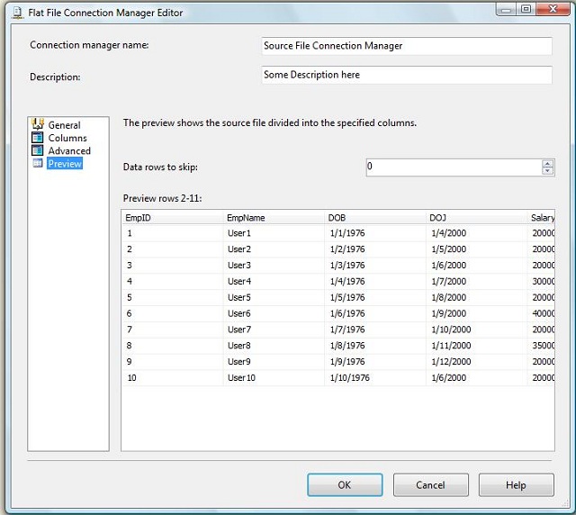 7. Click on OK. It will create a flat file connection manager for your source file.